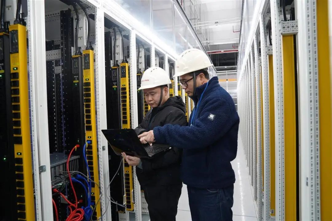 悦科(湖北)数据中心有限公司内,技术人员正在测试设备。