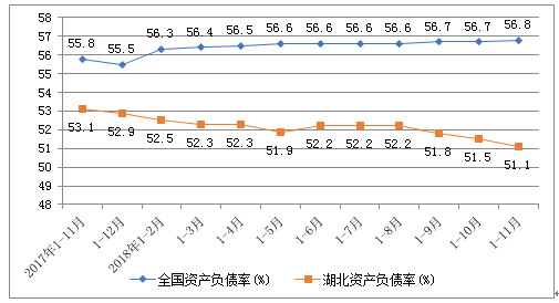 图2 全国和湖北各月累计资产负债率