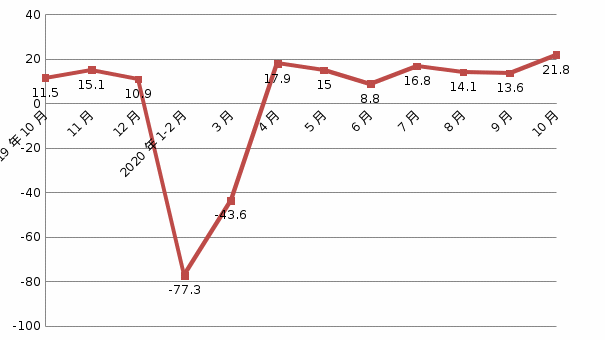 主导产业平稳向好。从新兴产业看,高技术制造业快速增长,10月当月增加值增长21.8%,比9月(13.6%)提高8.2个百分点,1-10月累计增速由负转正(0.7%),其中电子设备制造、医药行业当月分别21%和14.6%。从传统支柱产业看,汽车行业增长势头较好,全行业10月当月增长13.6%,比9月(7.3%)提高6.3个百分点。随着重大工程建设加速推进,基建产品快速增长,建材、有色、钢铁行业当月分别增长13.4%、19.1%和12.1%。