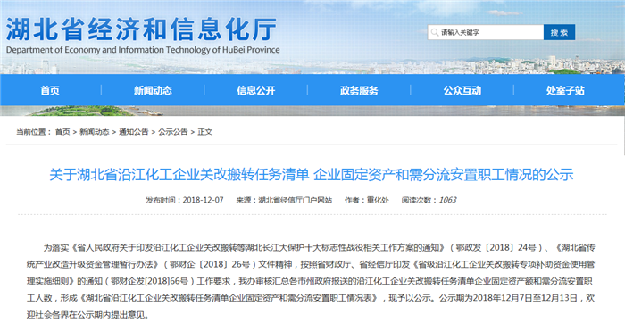 二是为扎实开展长江生态修护和环境保护,着力解决“化工围江”突出问题,修订和完善《湖北省危险化学品生产企业搬迁改造任务清单(修订版)》,对各市州政府报送的任务清单进行审核、汇总,并在我厅门户网站上进行公示;及时在网站公示《湖北省沿江化工企业关改搬转任务清单》及任务清单企业固定资产额和需分流安置职工人数情况,形成《湖北省沿江化工企业关改搬转任务清单企业固定资产和需分流安置职工情况表》,并在厅网站上进行公示,并将公示结果作为因素法切块计算资金依据,为全省沿江化工企业关改搬转专项战役有序推进奠定坚实基础。