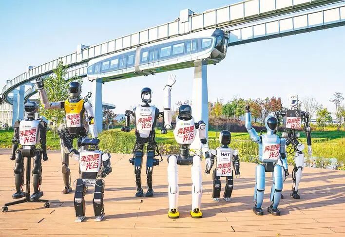 11月4日,光谷中央生态大走廊,“天问”(后排右一)等8台人形机器人齐聚一堂,为光谷马拉松助威。这8台高矮各异的机器人来自5家光谷企业和高校,都已经具备高质量运动能力。