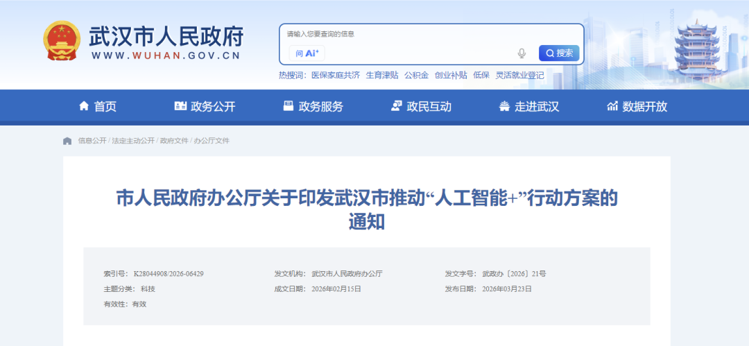 3月23日,武汉市人民政府办公厅发布《关于印发武汉市推动“人工智能+”行动方案的通知》。