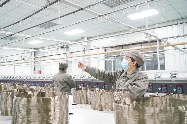 近日,襄阳汇尔杰新材料科技股份有限公司车间内,机器将玄武岩矿石倒入熔炉,经过1600℃的高温,碎石变成了“水”,熔炉下方出料口“吐”出一根根“细丝”。这些“细丝”就是玄武岩纤维,能抵抗1200℃高温。图为员工正在生产线上忙碌。