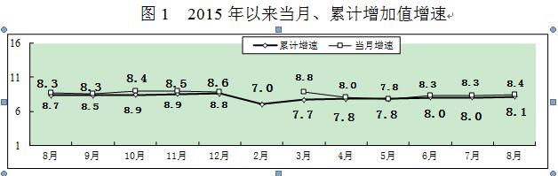 8月份,在供给侧结构性改革深入推进和一系列稳增长、调结构等政策的作用下,全省工业增加值增长8.4%,环比加快0.1个百分点,仅次于3月当月的8.8%,为今年以来次高值。前8个月,全省工业经济保持总体平稳、稳中有进、稳中有好的运行态势,但当前不稳定不确定因素仍然较多,部分行业和企业生产经营困难,工业经济企稳向好的基础仍不牢固。