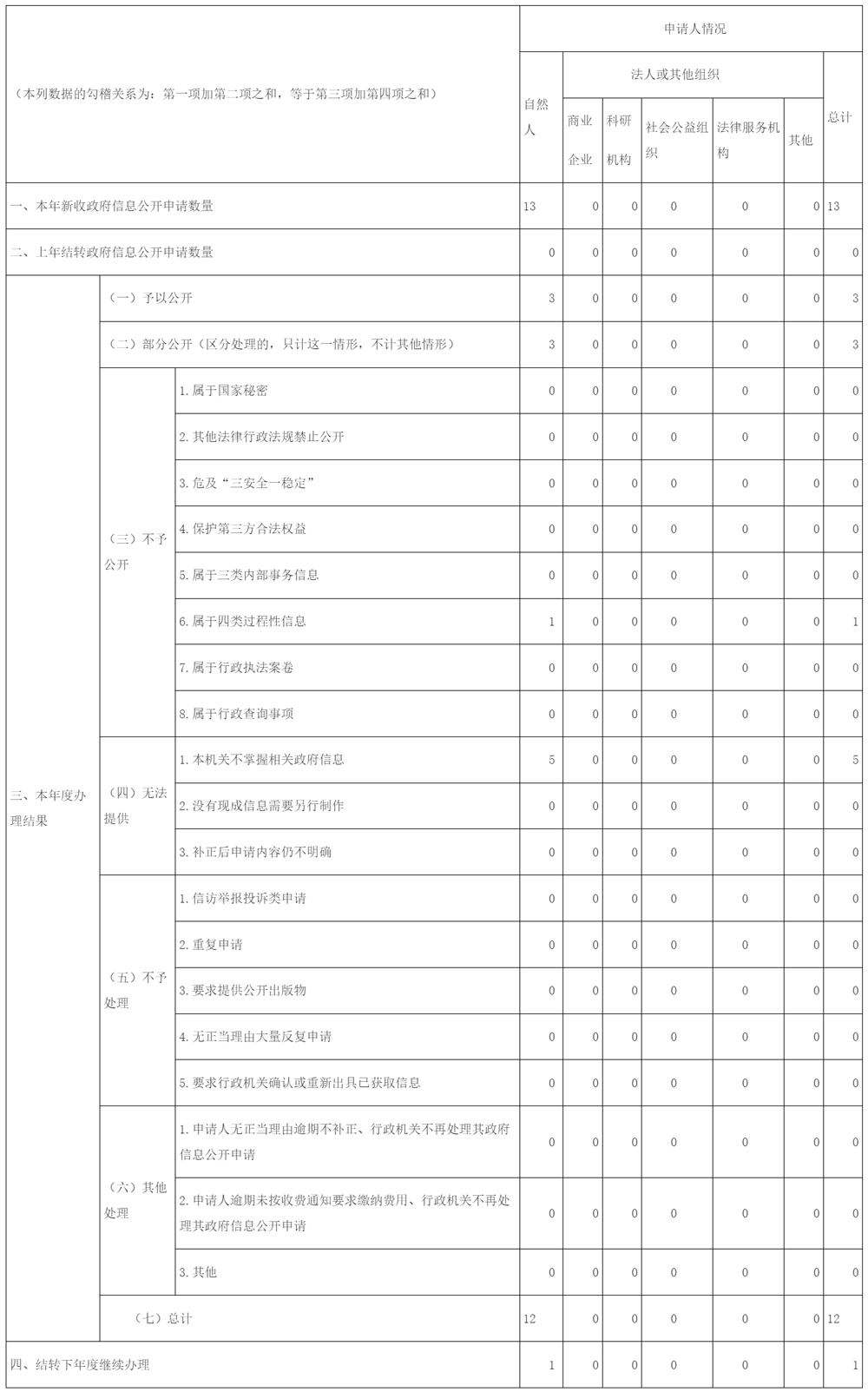 规范办理流程和答复书格式,准确适用答复条款,全年共收到依申请公开事项13件,有12件已在规定时间要求内答复办理,其中有1件因信息公开而被行政复议已重新办理。还有1件结转下年度继续办理。